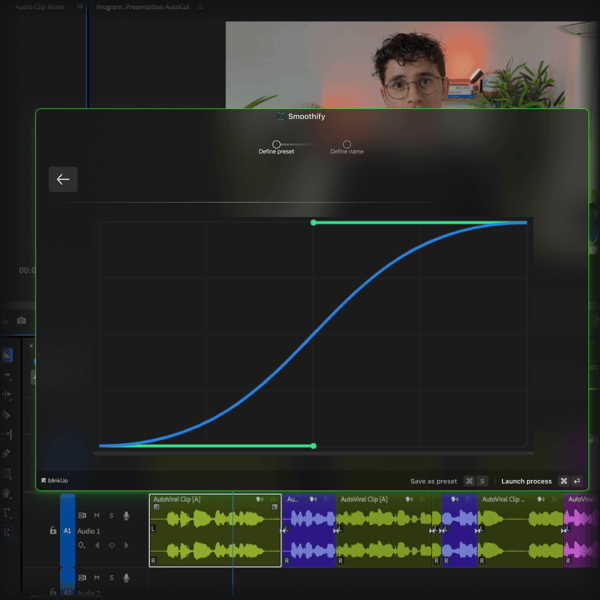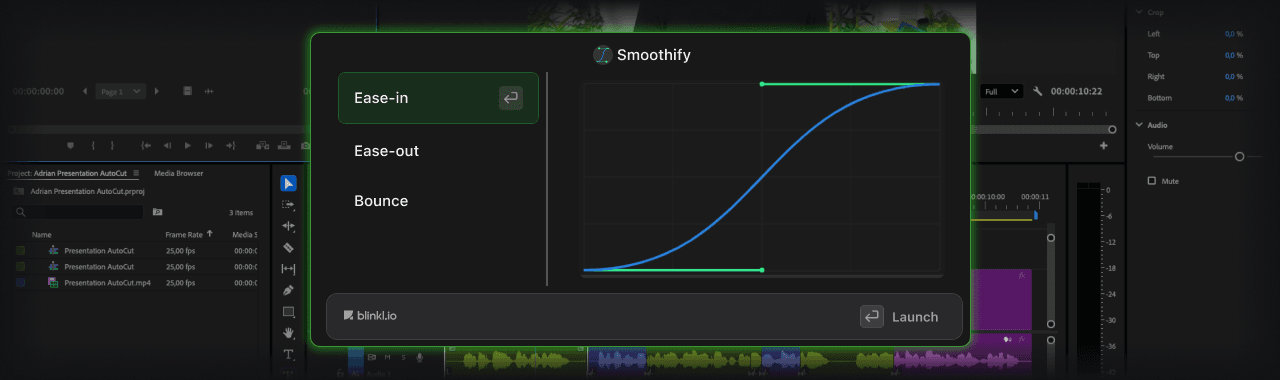 Smoothify is a blink for Adobe Premiere Pro that gives you full control over animation curves — right from the blinkl.io command palette. Apply natural easing, draw custom Beziers, rename/organize curves, and save your favorite presets in seconds.
